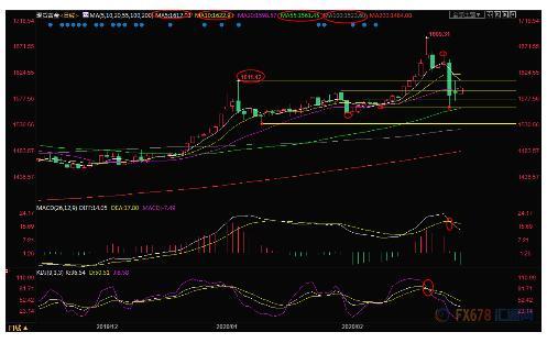 日线级别:“倒V反转”;MACD和KDJ死叉,5日均线下穿10日均线形成死叉,在顶破10日均线1622.94前,后市偏向震荡下行;55日均线支撑和2月12日低点支撑在1561.45附近;若下破该支撑,则增加后市看空信号;2月5日低点支撑在1547.57附近,1月14日低点支撑在1536.00附近;强支撑在100日均线1523.60附近。