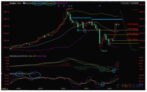 4小时级别:震荡上涨;MACD金叉,KDJ金叉,金价顶破了布林线中轨,短线有望进一步试探布林线上轨1669.65附近阻力。