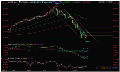4小时级别:单边下跌;不过KDJ低位金叉运行,MACD底背离后也有金叉趋势,汇价在97关口附近获得了一些支撑,短线汇价存在反弹机会,初步阻力在97.36附近,强阻力在下行趋势线97.70附近,若能顶破该阻力,则增加短线看涨信号;