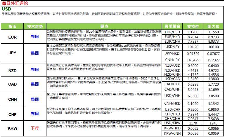 =607; 美国CNBC 引述白宫官员消息指,总统特朗普将向国会议员提出,将薪俸税税率降低至零,减税期限维持至今年之内。同时,双方亦会讨论薪俸税永久退税方案,退税额可用于扣减医疗及社会保障计划支出。不过,国会对特朗普的减税方案持怀疑态度。另外,据报白宫亦会提出资助美国页岩油行业,以应对沙特及俄罗斯近期爆发的石油减价战。消息有助增强市场对白宫救市及抗疫的信心,带动美股、美元及油价大幅反弹。