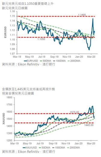 澳元及纽元在全球增长忧虑及国内大幅减息下显著走低,现时短期技术指标呈现极端状态,意味有可能出现反弹。如果澳元兑美元能够守住0.60区间,我们预计汇价将反弹至0.6440 - 0.6650。纽元兑美元可能已经在0.5935建立近期低位,如果汇价能守住有关水平,将有望短线向0.6250 - 0.6450反弹。金价短线或会在关键的1450美元支持位见到短期低位,而我们亦预计金价有机会向1550 - 1575美元反弹。