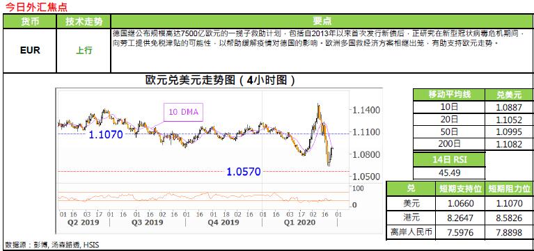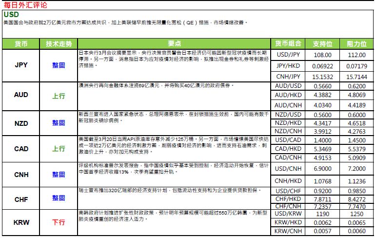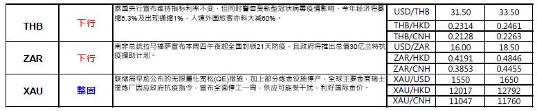 § 内地湖北省政府宣布,武汉市将于下月8 日起解除离开武汉的通道管控措施,有序恢复对外交通,而武汉市以外地区则率先于周三(25 日)解除离开湖北省的通道管控,人员可凭湖北健康码「绿码」安全有序流动。随着疫区逐步解封,反映内地疫情正逐惭受控。而随着内地逐步复工, 被疫情所压抑的需求有望得以释放,加上市场憧憬中央将加大基础建设项目以提振经济等,使近期铁价及煤价企稳,暂未受新冠病毒疫情及油价大跌所引发的市场恐慌所影响,煤及铁为澳洲主要出口,两者价格稳定料有利澳元中长期表现。
