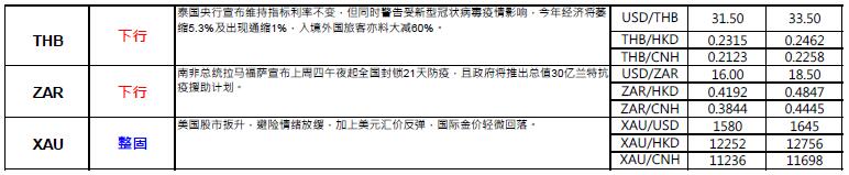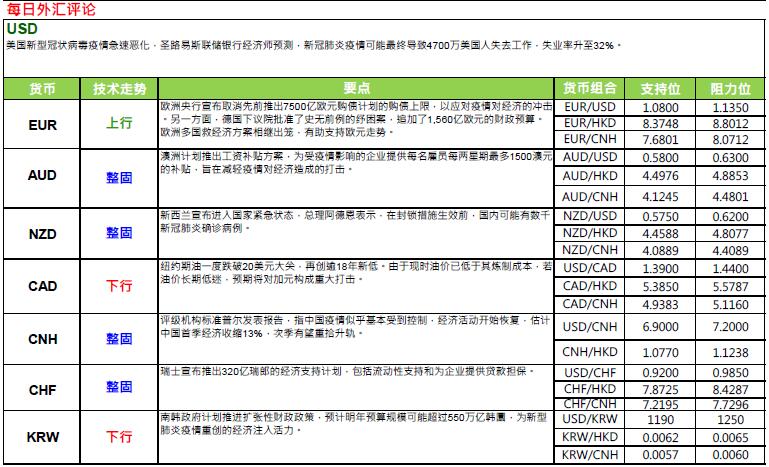 § 澳洲计划推出工资补贴方案,为受疫情影响的企业提供每名雇员每两星期最多1500 澳元的补贴,旨在减轻疫情对经济造成的打击。 同时,预期政府将为企业及个人提供租金援助,并放宽领取福利的限制。澳洲政府不断加码应对疫情举措,短期有助缓和市场对当地经济前景的忧虑情绪,支持澳元汇价靠稳于61 美仙以上水平。