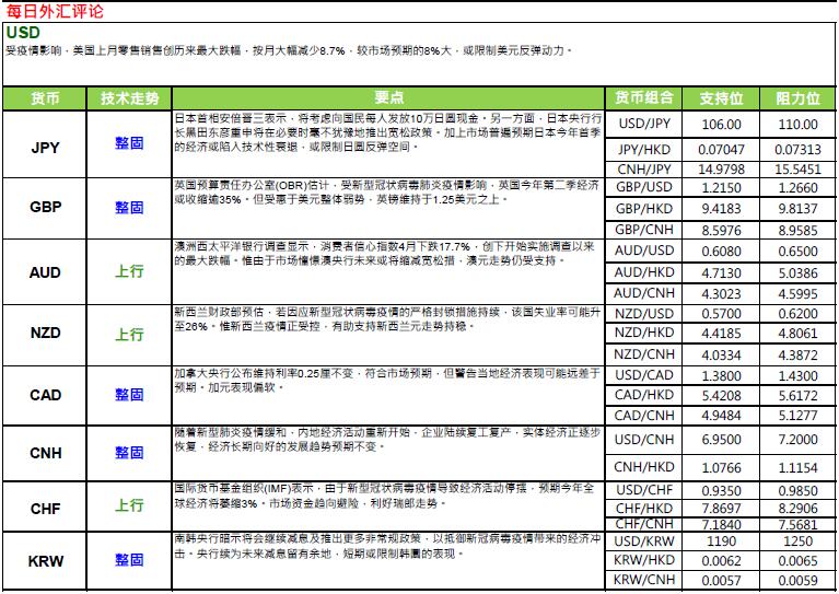 =607; 受疫情及隔离政策影响,美国3 月份零售销售按月急挫8.7%,是有史以来最大单月跌幅。如以按年比则为下跌6.2%。倘相比较2008/09 的金融海啸。当年美国的零售销售,用了16 个月时