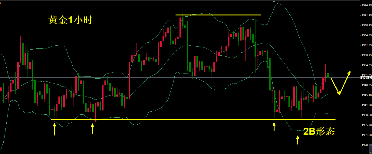 而从1小时图上看,前期在底部经历了充分的震荡,并且出现突破前期1936之后,又快速回到前低之上,形成2B反转形态,随后行情拉升,前期筑底比较牢固。虽然目前仍不能轻言多头回归,但在操作中可以偏向多头,下方支撑看一小时图布林线中轨,接着看1940/1936,上方阻力1954/1962/1972,当行情测试支撑阻力收取pinbar信号时考虑博弈,震荡操作为主。