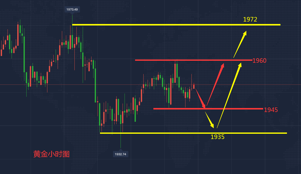 简单理解,今日行情若先回落,回落不破1945-46做多,破位则等1934-35附近做多,目标看1960附近。若反抽不破1960位置,轻仓做空,破位1960继续看涨到1972附近。