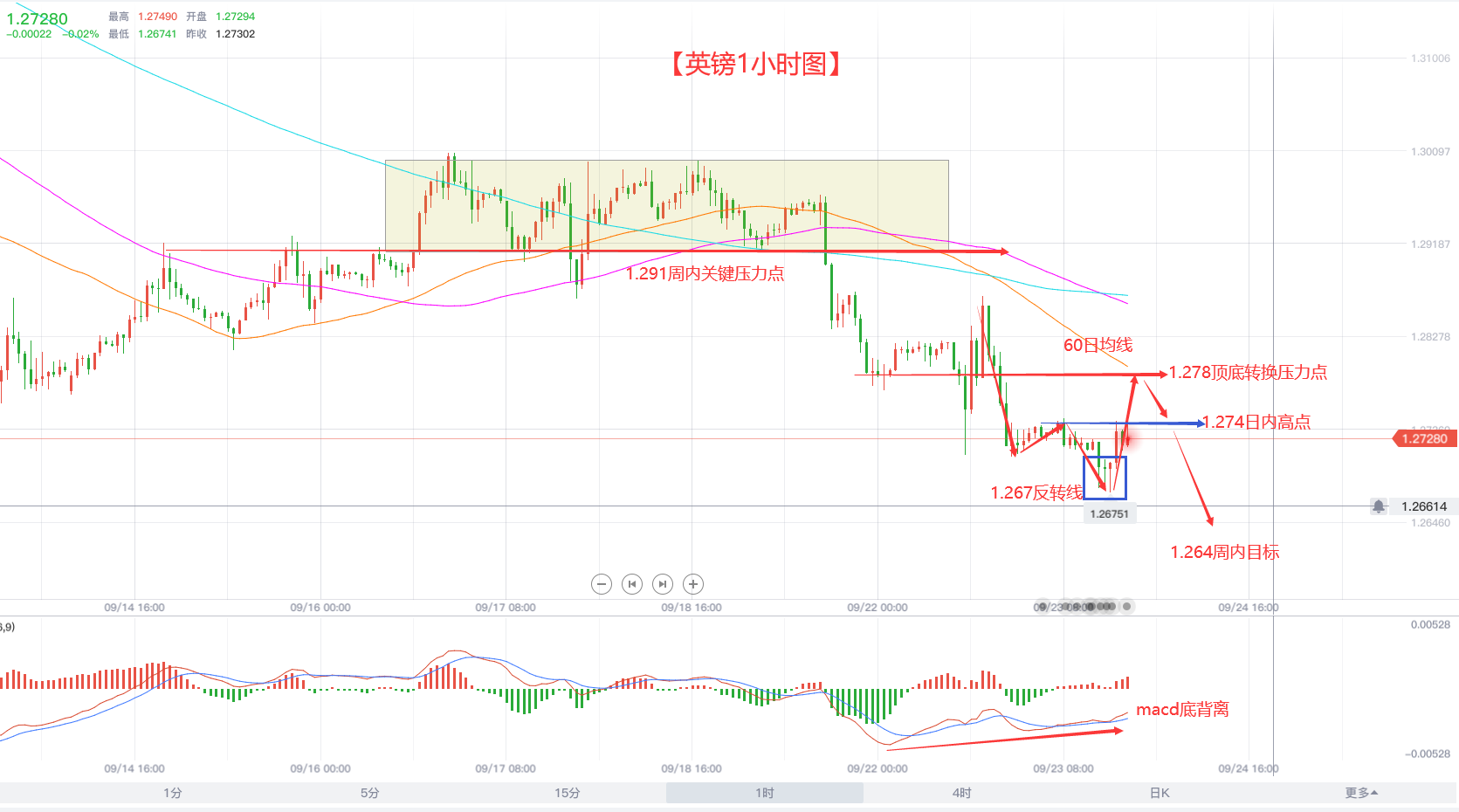 µ«ÊÇÕâ²¢²»ÄܸıäËûÔÓеĿÕÍ·Ç÷ÊÆ£¬Ä¿Ç°½×¶Î£¬ÐèÒª¹Ø×¢µÄÊÇÔç¼ä¸ú´ó¼Ò˵µ½µÄ·´µ¯1.278µÄ¶¥µ×ת»»Ñ¹Á¦£¬1.283¾Í²»Óùý¶à¹Ø×¢ÁË£¬60ÈÕ¾ùÏßÒѾÏÂѹ£¬ÏÂÐÐѹÁ¦Í¬ÑùÒ²ÔÚ²»¶Ï×ߵͣ¬ËùÒÔ£¬¶ÔÓÚ½ÓÏÂÀ´µÄÓ¢°÷½»Ò×£¬Ö»ÐèÒªÒÀÍÐ1.278½øÐн»Ò×¼´¿É£¬²»ÐèÒªÔÚµÈ1.283Õâ¸öµã£¬ÖÜÄڹؼüѹÁ¦Î»ÓÚ1.291£¨Ç°ÖµÇø¼äÔì¶¥µÄµ×²¿£©£¬ÖÁÓÚÄ¿±ê£¬ÏȽøÐйØ×¢1.274ÈÕÄڸߵ㣬Æä´Î1.264£¨À´×Ô1.140³õ´Î·´µ¯µÄ¸ßµãת»»Ö§³Å£©¡£