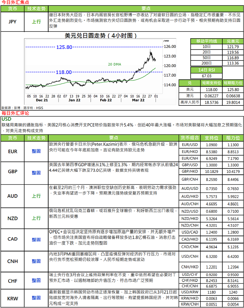 · 联储局在制定货币政策时最看重的通胀数字,美国 2 月份 PCE 平减物价指数按年升幅加速至6.4%,创近 40 年高位。期内,核心 PCE 平减物价指数则按年续升 0.2 个百份点至 5.4%,亦创 39年高位。美国通胀高企,续带动巿场对联储局加息预期。据最新利率期货价格变化显示,市场预期联储局于 5 月加息 50 基点的机率徘徊于 70%以上水平。