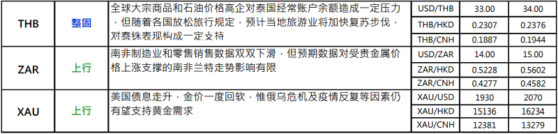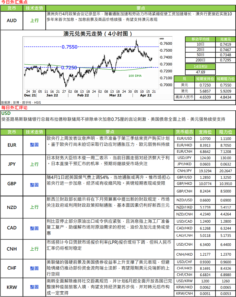 · 美国圣路易斯联储行长布拉德表示,联储会需要迅速采取行动,并通过多次 50 个基点的加息幅度,使利率于年底之前达到 3.5%左右的中性水平,且不排除一次过加息 75 个基点的可能性。此外,布拉德又指局方有望于 5 月份会议上决定开始缩减资产负债表,并相信联储局有能力在不造成衰退的情况下控制通胀。布拉德偏鹰言论,带动美国长债息及美元上升。