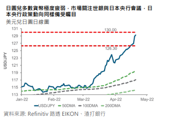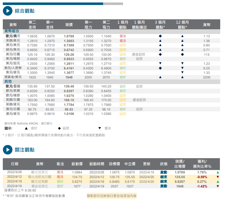 美债孳息率持续上涨使美元指数来到 101 水平,也受到日圆异常疲弱和超卖所推动,日圆自 3 月初以来兑美元与多数货币下跌。我们目前结束了看跌瑞郎兑日圆的观点。日本央行行长黑田东彦和日本财政部长铃木现在态度似乎更加一致,认为日圆跌幅剧烈可能对国内经济不利。 日圆随时可能出现大幅修正反弹,但任何政策干预可能需要铃木与即将会面的美国财政部长耶伦达成协议,同时黑田东彦也要保持货币政策灵活性。参考技术走势,我们预计美元兑日圆阻力位在 130 附近。若出现外汇市场干预,可能在近期产生更大影响,122-124 为目前初步目标价位。