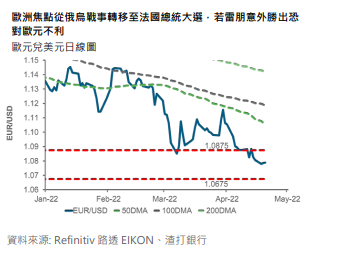 与日圆相比,尽管地理位置更接近俄乌战争,但欧元自 3月初以来表现稳定。预计本周日的法国总统大选有利马克龙,但若雷朋意外胜出可能会冲击市场和使得欧元走弱。