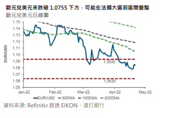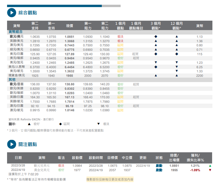 欧元在 1.0755 的趋势低点上方止跌,随後上涨。若反弹能突破 1.0930-50 阻力可能暗示升势将会延续,但俄乌战争和周日法国总统大选仍存在许多不确定性。马克龙预期可胜选,但若雷朋意外胜出,可能会使欧元短期面临强劲的压力。我们目前对看跌欧元的观点抱持较贴价的中性价位,若跌破 1.0755 或将进一步测试 1.0635.