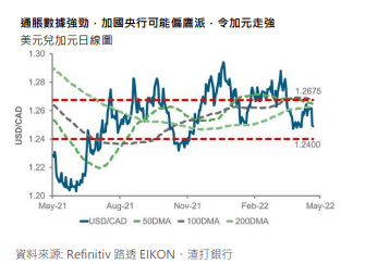 美元兑加元因通胀数据上升而大幅下跌,这提高了市场对加国央行在夏天前进一步加息一至两次各 50 个基点的预期。若美元兑加元持续跌破 1.24 将使近期前景更为黯淡,更强的支撑在 1.2285 ,并可能下试 1.20 的 2021 年低点,而强劲阻力则在 1.2625-75.