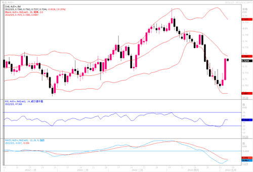 周三(5月4日)美元指数跌0.95%至102.50,创3月9日以来最大盘中跌幅;美国10年期国债收益率下跌5个基点,收益率曲线变陡,之前美联储以二十年来最大幅度加息之后,鲍威尔缓解了市场对美联储将采取更激进紧缩步伐的担忧。澳元兑美元涨逾2%;澳洲联储周二(5月3日)出人意料地将其指标隔夜拆款利率大幅提高25个基点至0.35%,这是十多年来的首次加息,该行并表明随着疫情刺激措施的落幕,将会有更多的加息。在美联储加息幅度不在激进,而澳联储也做出加息举动的情势下,澳元兑美元的反弹显得气势如虹。在日线图上,MACD开始呈形成底部金叉迹象,汇价目前逼近布林带中轨0.73,若进一步突破上方有望向 0.74-0.75进击。