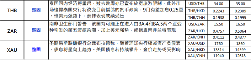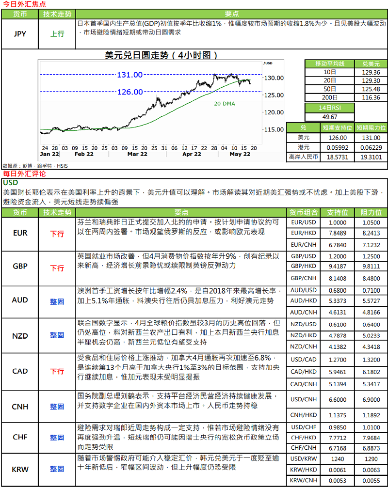 · 日本首季国内生产总值(GDP)初值按季年比收缩 1%,是去年第三季以来再次陷入收缩,惟幅度较市场预期的收缩 1.8%为少。若按季比较,GDP 则见收缩 0.2%,市场原先预期为收缩 0.4%,去年第四季 GDP 增幅亦被下调至 0.9%.日本首季经济表现不振,主要受 Omicron 新冠疫情及贸易表现疲弱所影响,反映日圆走弱正增加进口成本负担。虽然当地新冠疫情已见缓和,且即将重新开关,有望支持次季经济表现。但受俄乌危机所带来的能源价格攀升、联储局加速收紧货币政策,以及日圆贬值等因素共同影响,料为未来经济前景带来一定挑战。