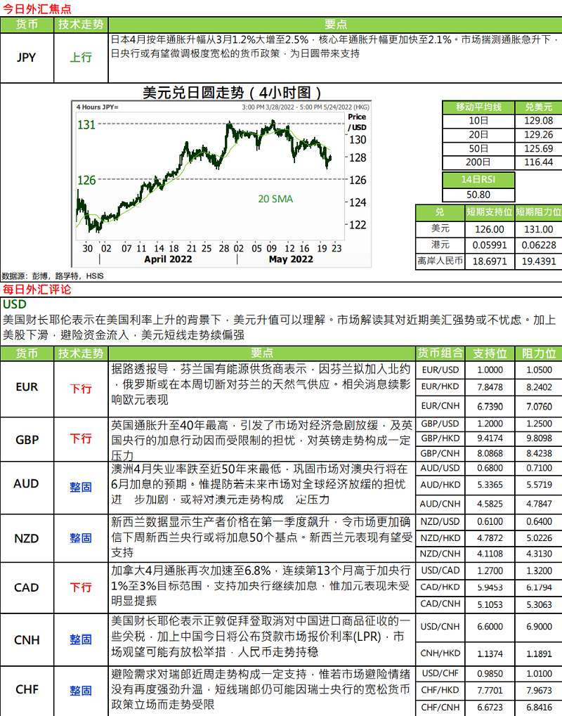 · 美国财长耶伦指正推动取消部份对内地进口产品关税,并指这些关税不具备战略意义,但影响美国消费者和企业的利益,而且削减关税可能有助缓解通胀。如果削减关税可以落实,不单有机会降低美国通胀并减低环球市场的不确定性,更有助改善内地制造业及出口· 国际货币基金组织(IMF)总干事格奥尔基耶娃周四出席七大工业国(G7)财长及央行行长会议时,表示全球央行面对需要同时应对高通胀及提防经济陷入衰退,是一项非常之困难的操作,尤其是面临俄乌冲突爆发与内地收紧防疫管控措施之后。通胀不仅是过渡性问题,而且冲击可能更大,将导致高通胀持续一段时间。不过,她对中国经济前景不太感到忧虑,当局有财政与货币政策工具可以运用