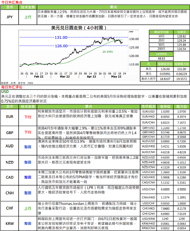· 本周有两央行议息,分别是新西兰(周三)及韩国(周四)。焦点是在新西兰身上,因市场估计新西兰央行加息半厘,把其息率推上 2 厘位置的机会甚高。虽说加息是意料中事,但一旦息率攀至 2 厘水平料对新西兰元可带来一定吸引力。除了上述两议息会,联储局本周四将公开其本月初议息会议记录亦值得关注。尤其是市场开始担心美国经济会否出现衰退,不排除在联储局的议息会议记录中会给予大家一些启示。至于经济数字方面,重点在周二,因当天欧美、日本及澳洲等将公布一系列 5 月份采购经理指数。透过这些数字我们将更能掌握最新的环球经济形势。