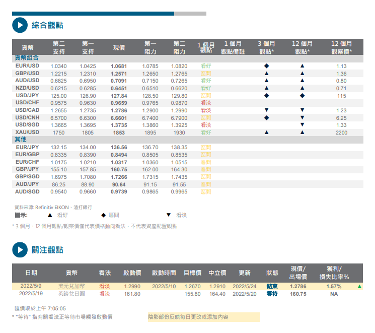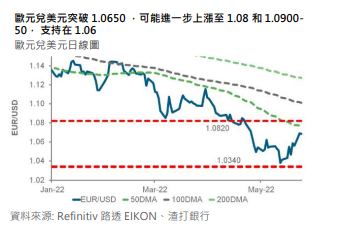 欧洲央行表示可能将在 9 月将存款利率走出负利率水平,美元指数下跌,美股与欧股上涨。受益於服务业需求回暖,德国 5 月份的企业展望优於预期。欧元兑美元在突破强劲阻力 1.0650 後升至 1.07,近期技术走势显示可能进一步上涨至 1.08 附近的强劲阻力区,接着是 1.0900-50.我们将关注欧元会否回落至 1.06 以下,因为可能表明目前的升势只是一个假突破。