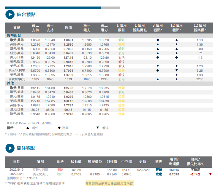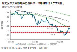 全球股市上升,美国国债收益率下跌,美元指数上升,较早时联储局 5 月会议纪录显示决策官员们认为美国经济强劲并同意加息 50 个基点。欧元兑美元日中曾跌至 1.0641 低位,但在联储局公布纪录声明後成功收复了部分跌幅。欧元兑美元的短期技术走势仍然偏向看好,初步阻力料位於1.0785,若汇价跌破 1.0520 则意味趋势改变。