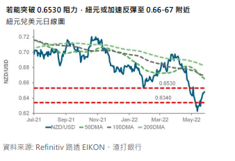 纽西兰央行一如预期加息 50 个基点,纽元兑美元走高。不过纽西兰央行发表的最新预测显示利率或将达 3.95% 的水平,这表示 7 月和 8 月将分别有机会进一步加息 50 个基点。纽西兰央行偏鹰和商品价格上升都有利纽元,若突破阻力位 0.6530 将进一步确认纽元兑美元的看好趋势。