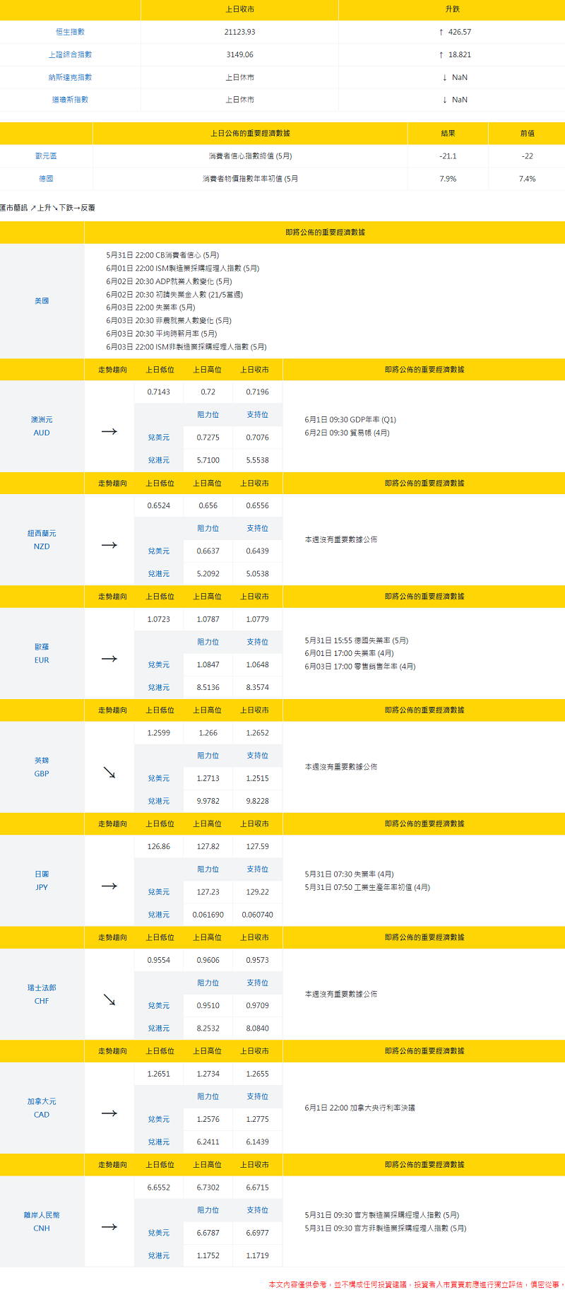 大丰银行:今日外汇走势分析和投资策略(2022年5月31日)