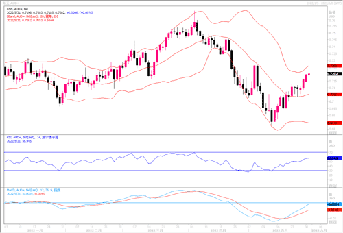 上周五澳元震荡上行,刷新16个交易日高位,现汇价交投于0.7190附近。除美元指数在多重利空因素的联合打压下持续回调并刷新24个交易日低位对澳元构成了有力的支撑外,市场的风险情绪转暖,大宗商品原油,铁矿石,国际铜等价格走高也是支撑澳元走高的重要因素。在日线图上澳元兑美元继续保持在上升轨道中,各类技术指标继续向正向区域发散,这轮澳元的反弹上升势头较强。但短线4小时图上 ,澳元遇阻于0.72,技术指标出现超买迹象,短线慎防获利回吐的调整。下方留意0.7100的支撑,若失守,小心势头的转变。