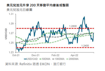 加元兑美元跌至近 10 日低位,即使加拿大央行表示通胀将决定利率上升的速度,并重申需要考虑是否加息超过 50 个基点。加元短期内可能会区间波动,阻力在 1.28,而支持则在 1.24.