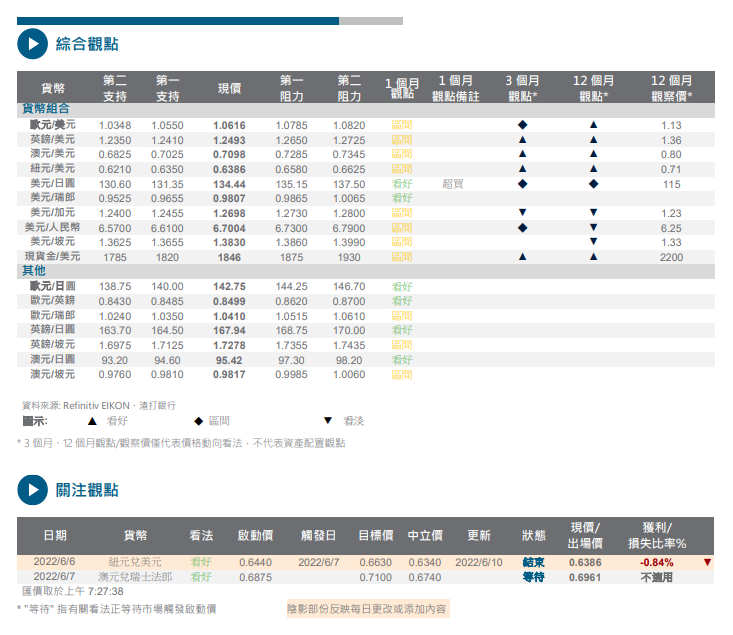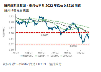 受风险情绪拖累,澳元与纽元表现受压。由於新冠疫情忧虑回升,中国在上海和北京实施了新的封锁限制,利淡贵金属和油价下跌。两种货币的短期前景目前处於区间波动,我们亦在损失的情况下结束看好纽元的观点。