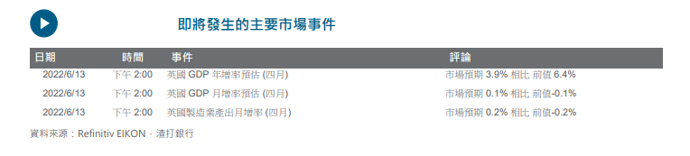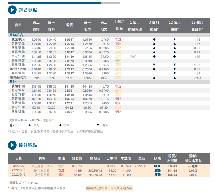 美国通胀数据超乎市场预期推升美债孳息率走高,美股下跌。美元再度上扬,可能很快将会重新测试美元指数於 5 月的高点 105.通胀数据高企提升了市场对美联储加息的预期,跨资产的波动性在会议前可能上升,接着本周瑞士、英国与日本央行的动向亦值得关注。我们短期观点已转为看好美元,对风险货币转趋谨慎。欧元可能下滑迈向1.0440 支持,若失守恐怕会走低至 1.0340 之下。