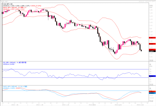 英镑兑美元上周震荡回落,主要受累于强势美元,英国政局危机施压英镑。但下周英国央行升息预期或能帮助限制英镑下行幅度。尽管经济形势不稳,市场预计英国央行将继续收紧政策,在6月16日的货币政策会议上宣布加息25个基点。且有分析机构预期,英国央行基准利率加到1%将会停止加息。因为市场人士仍然担心英国经济前景,通胀高烧不退加剧了滞胀风险。在日线图上,英镑兑美元已跌穿布林带通道中轨,各类技术指标也转向负向区域,英镑弱势走势明显。4小时图上,汇价也远低落于各短期均线之下,近期上方的强压力在1.2470附近,下方若进一步下行,目标将是1.22以及5月中旬到达过的低位1.2156。短线须防范一下空头回补的反弹风险。