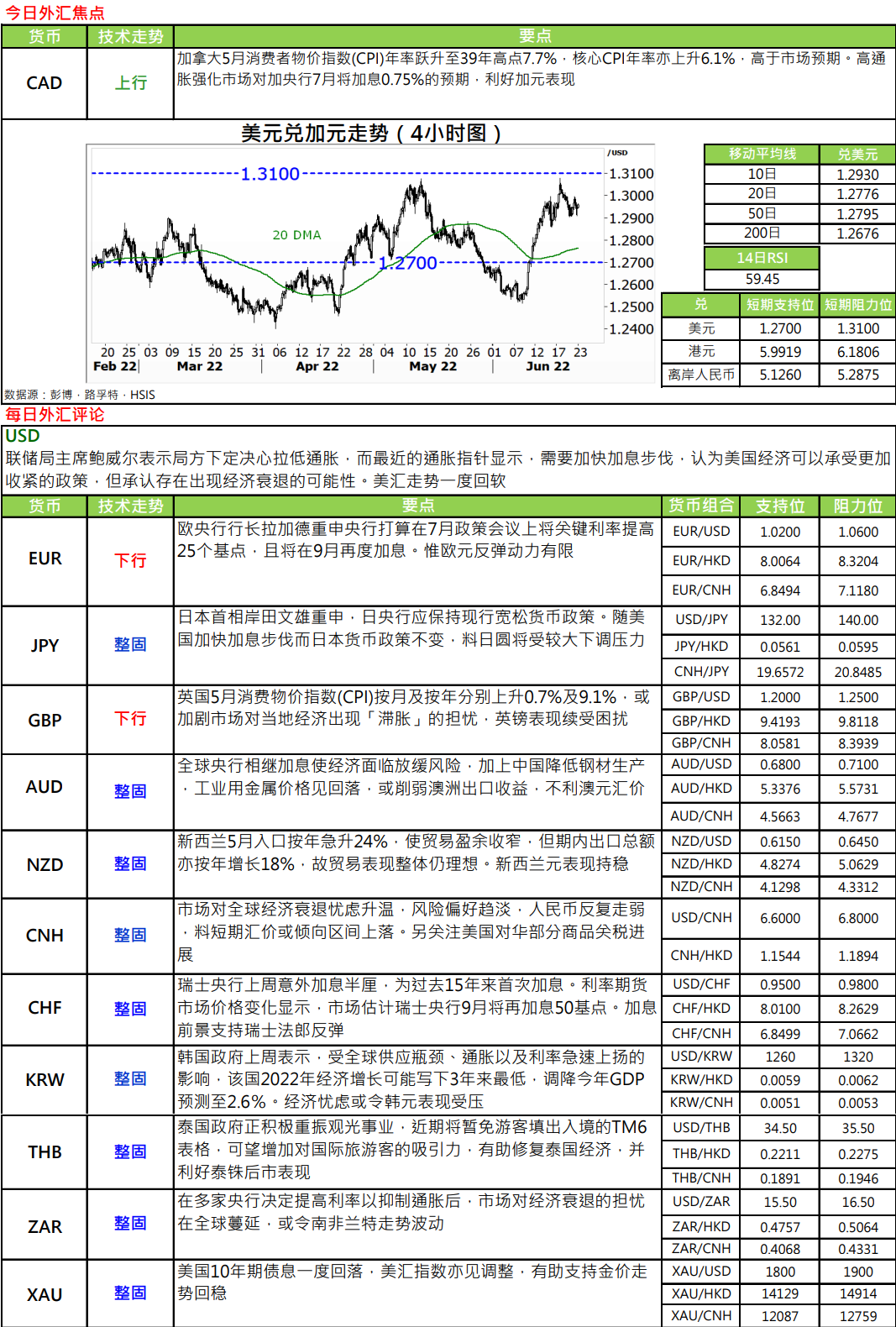 · 加拿大 5 月消费物价指数(CPI)按年续升至 7.7%,续创超过 39 年以来高位,市场原先预期及前值均为 7.4%,主要仍受俄乌危机所引致的能源、大宗商品及食品价格上升所推动。此外,当地住房及交通成本亦续见升温。期内,核心 CPI-普通(common) 按年亦上升 3.9%,较前值上升 0.7 个百分点,市场原先预期为增长 3.5%.加拿大 CPI 连续第 15 个月高于央行 2%至 3%的目标,增强市场对加央行或需要于 7 月 13 日的议息会上,大幅加息 75 个基点的预期。