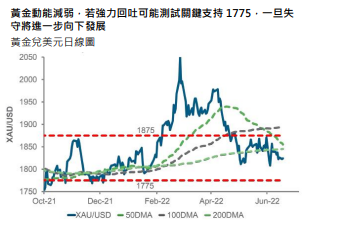 黄金近期可能面临不确定性升温与波动加剧,由於上升动力减退,短期内风险偏向下行。我们预计 1775-1800 区间具有强劲支持,但若跌破可能会大幅下跌迈向 1675.通胀预期飙升或地缘政治风险上升也可能驱动黄金反弹迈向1875.