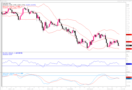 在隔夜市场上,欧元区公布6月经济景气指数为104,创去年3月以来新低。尽管当日公布的制造业和服务业数据的信心有所改善,但对未来前景不那么乐观,欧元区五大经济体的市场信心下滑,其中荷兰表现最为明显。数据促使欧元兑美元在隔夜外汇市场跌穿1.05,盘中最低抵达1.0435。4小时图上,欧元连续拉阴,汇价远低落于短期均线下方,各类技术指标超负向区域发散,欧元弱势尽显。欧元若继续下滑,下方将再次考验6月中旬到过的低位1.0359,上方1.0530构成初步的阻力。