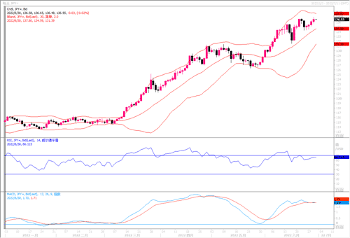 在周三(6月29日)外汇市场,美元兑日元继续攀升触及137整数关口,创1998年10月以来新高。市场上似乎抛售日元的欲望仍然保持强烈,这一切都归结于日本央行是唯一没有收紧政策的央行。4小时图上,美元兑日元仍沿着短期均线之上小幅试探性爬高,MACD、RSI等技术指标也很好地配合性向超买区域延伸,若137.00被彻底捅穿,上方目标恐会进一步瞄向140.00。若在日本央行继续未对其货币政策做出任何变化且不入场实施汇率干预的话,料日元的弱势难挽。目前在134.50-135.00区域存在不少逢低购入美元盘口,短线须防一定的获利回吐风险。