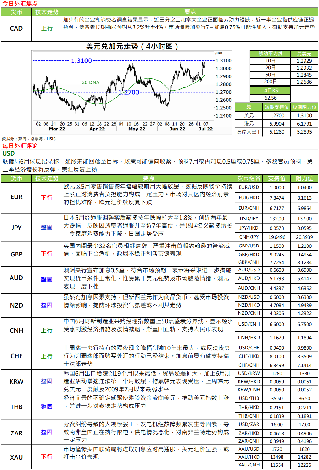 · 联储局 6 月议息纪录显示,局方官员认为可能需要一段时间,才能看到通胀率回落至局方目标(2%),预料下次议息时进一步加息 0.5 厘或 0.75 厘。虽然经济增长风险偏向下行,金融环境收紧的负面影响可能超出预期,但局方官员仍然预期第二季经济增长料将反弹。