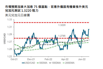 即使其他商品货币走弱,美元兑加元仍相对平稳。市场预期加拿大央行下周将加息 75 个基点,加拿大国债收益率因此全线走高。美元兑加元阻力料在 1.3080,若向上突破则可能使我们的短期观点转为看好。