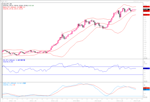 近几个交易日内,美元兑日元保持窄幅稳定的走势,波动区间主要集中在135-136之间。美国公布了美联储6月份的会议纪要,内容继续证实了美联储在加息方面鹰派姿态,美联储这种继续坚持积极加息的态度,也预示着美元走升行情还会持续一段时间,尤其是当前对于全球经济衰退的担忧使得市场对安全资产的需求不断提高的行势下,美元受青睐程度仍未褪色。技术方面看,目前美元兑日元仍处于20年的高点呈窄幅震荡整理中。目前上方的强阻力在137.00,能否突破朝140.00目标前进尚难断定。从日线级别图上看,各类技术指标出现背离,还是须防范美日冲高无果后的深度回撤调整风险。目前下方134.30是关键的支撑水位,若跌破,或可看到美元兑日元较深幅度的回撤。