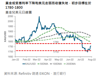 金价向 1755 阻力弹升。我们倾向当金价下跌至 1710 时增持。金价自上周跌至 1680 的中期支持後,展现偏强的反弹走势。利率下降和美元回软都有望为黄金後市稳步上