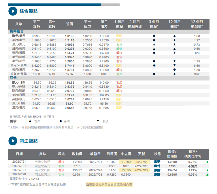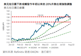美元兑日圆跌幅逾 1.5%,因市场预期联储局偏鹰程度下降及美债利率回落。美元兑日圆今年初到七月中旬高位已上升 20%,在此背景下我们认为若美债利率走势趋稳,美元兑日圆可能会继续下跌,因日圆可望受惠於短仓平仓、货币估值便宜,以及日圆再度成为避险工具等因素。我们将看淡美元兑日圆的中性价位下调至 136.50,至於 131.50的目标价则维持不变。