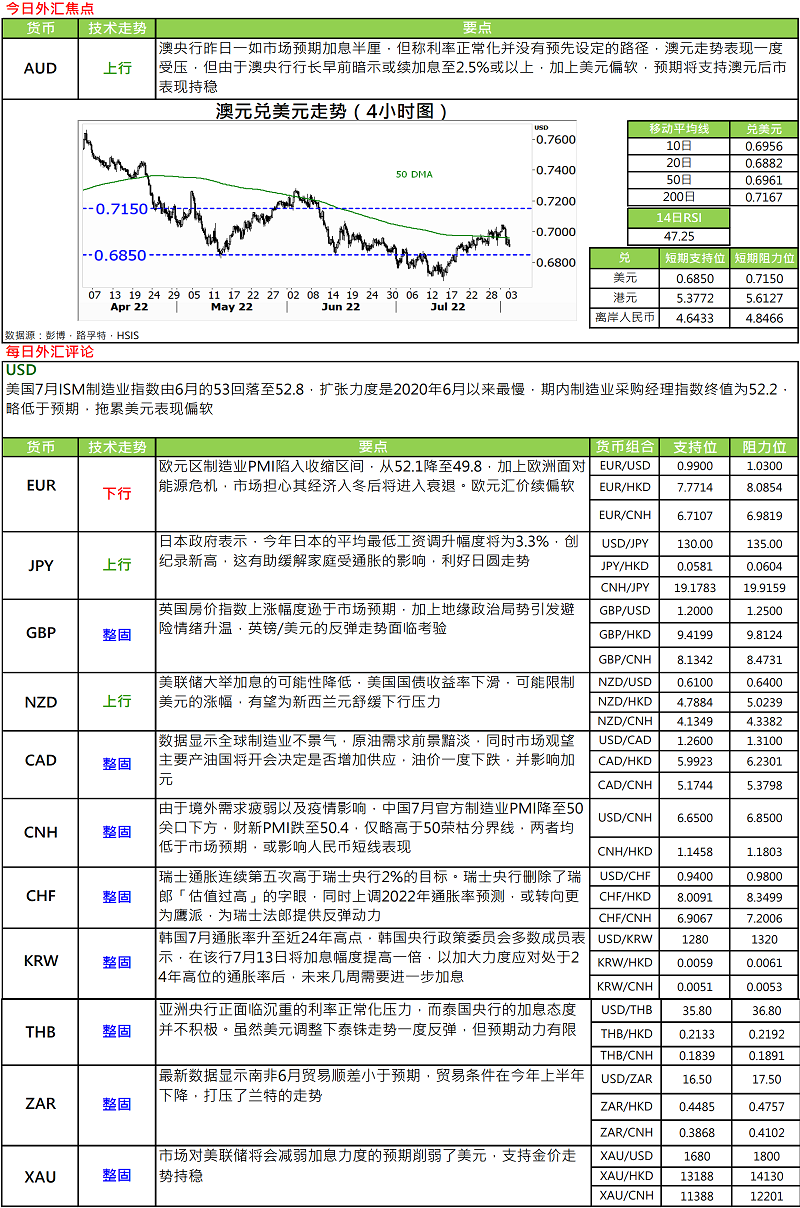 · 澳央行于周二(2 日) 议息会后如预期加息半厘,把官方息率推上 1.85%水平。在其声明中,澳央行行长洛威指,该行会继续其加息步伐,截止息率重返合适水平,但就不会定下加息指引。由于过去澳央行曾提出 2.5%为合适的中性息率水平,现市场估计待澳洲息率加至 2.5%其是次加息周期或将见顶。对于 9 月议息会,按利率期货市场价格变化显示,市场估计加息 25 基点是共识,但再加息半厘机率却只有 25%.