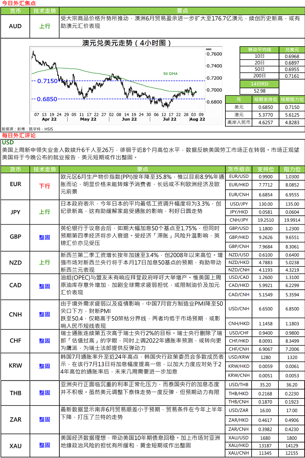 · 英伦银行于昨晚(4 日) 的议息会后,一如预期,宣布大幅加息 50 个基点至 1.75%,是连续第六次加息,加幅是自 1995 年来最大。于 9 名委员当中,只有 1 名支持加息 25 个基点,其余委员均支持加息 50 个基点。主要目的是应对目前高达 9.4%,且预计到 10 月可能攀升至 13.3%的年通胀率。不过,市场普遍认为以目前 1.75%的息率,并不足以压抑接近双位数字的通胀率。此外,英伦银行又预期,第四季经济将步入衰退,且可能持续五个季度,GDP 将收缩 2.1%.受经济「滞胀」风险升温影响,英镑汇价受压