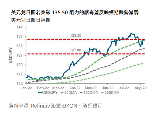 美元兑日圆上升,受美元走高所影响,主要由於美国 2 年期国债利率与日本国债利率的利差扩大所致。由於短期美元下行动能可能会暂时减弱,我们在录得亏损下先行结束看淡美元兑日圆的观点。美元兑日圆的阻力料在於 135.50,若能向上突破则可能令短期前景转为看好。