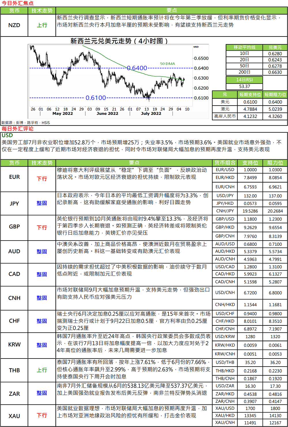 · 新西兰央行季度商业调查显示,第三季 2 年通胀预期由前季的 3.29%回落至 3.07%,终止连升八个季度的趋势,反映央行加息对通胀压抑效果渐现。不过,由于 1 年期通胀预期仍高企于 4.86%,市场认为央行短期内放慢加息步伐的机率不大。据最新利率期货价格显示,新西兰央行于 8 月 17 日议息会上加息 50 基点至 3%的机率已达共识,至于年底前预期息率攀至 3.75%的机率亦达共识。