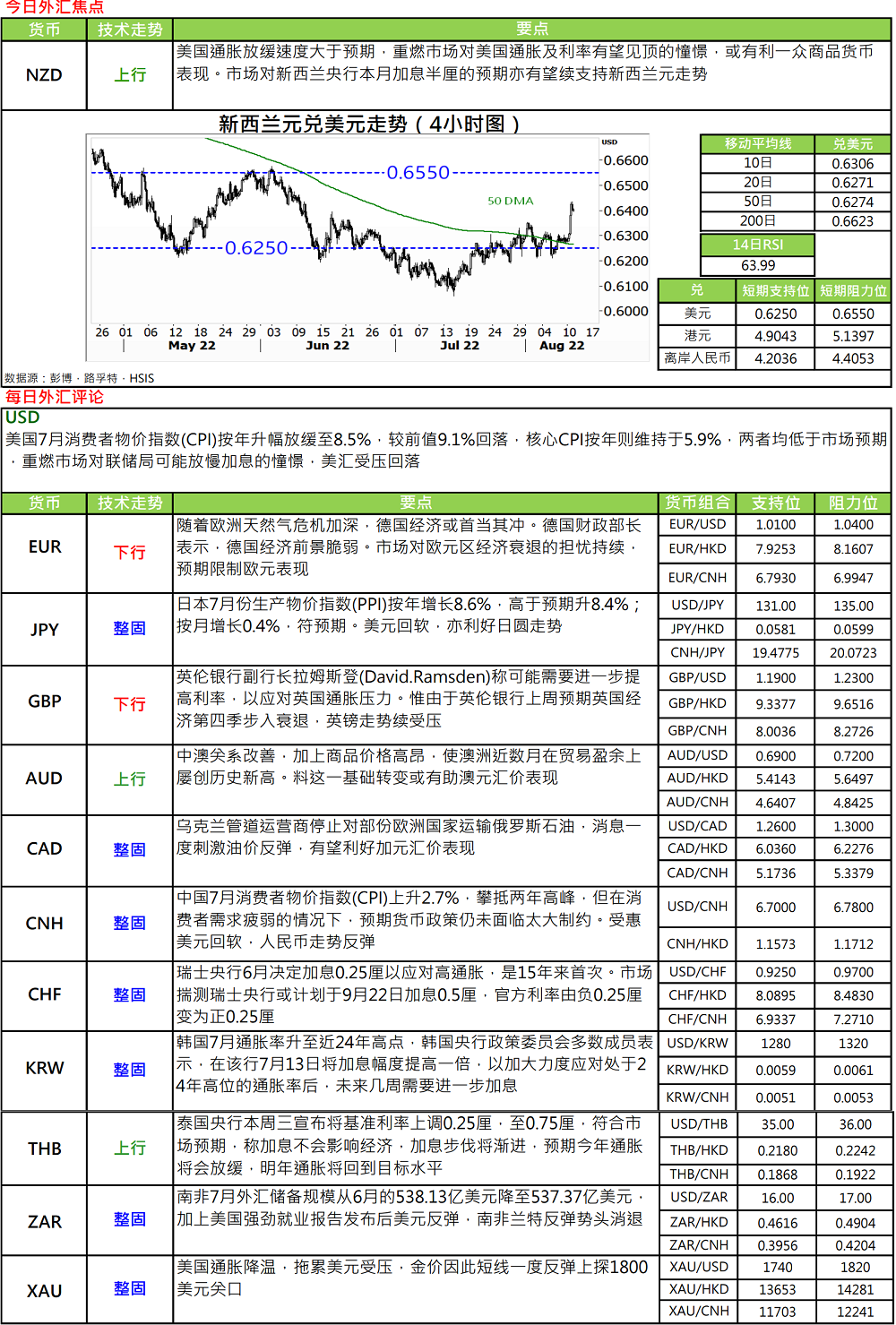 · 美国 7 月消费物价指数(CPI)按年升幅放缓至 8.5%,较前值 9.1%的超过 40 年高位回落 0.6 个指数点,亦低于市场预期的 8.7%,主要受能源、新车及机票价格升幅放缓所影响。不过,食品价格按年续升 10.9%,创近 43 年以来高位。同期,扣除食品及能源的核心 CPI 按年维持于 5.9%,亦低于市场预期的 6.1%.美国通胀放缓速度大于预期,重燃巿场对联储局可能放慢加息的憧憬,拖累美元表现。惟由于欧元仍受俄乌事件等众多不利因素困扰,美汇下行空间或有限。相反,市场憧憬投资气氛改善,一众高息及具贸易条件优势的商品货币或再受关注