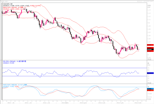 美元兑一篮子货币周二变化不大,投资者在等待周三美国零售销售数据和美国联邦储 备理事会(FED/美联储)公布的7月会议记录。由于通胀高烧不退,投资者加大了对美联储将继续激进加息的押注,美元从上周触及的六周低点反弹。然而,交易一直不稳定,因为美联储要到9月20-21日才开会,而且在此之前还有更多消费者物价通胀和就 业数据出炉。随着指标10年期美债收益率保持在3%以下,以及信贷和股票市场的改善,金融条件更加宽松,投资人愈发 认为美联储可能需要更加激进地收紧条件,以应对不断上升的物价压力。德国周二获得了主要天然气进口商的承诺,将从今年冬天开始保持两个浮动的液化天然气(LNG)终端的充分供应,以减少对俄罗斯燃料的依赖。为此,周二欧元兑美元上涨0.10%,至1.0169美元,此前曾跌至1.0121美元,为8月3日以来最低。日图在1.0370下方受阻连续回落并跌破20日均线,随机指标受下降趋势线打压;4小时图震荡走低,空头动能猛烈;小时图短线空头排列,显示欧元近期进入偏弱势状态。
