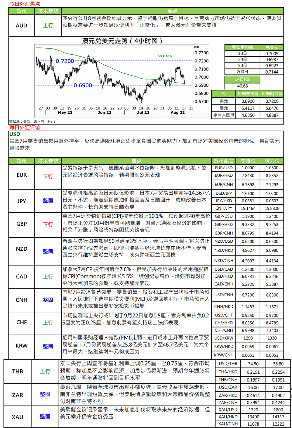· 美国 7 月零售销售按月持平,较前值回落 1 个百分点,市场原先预期为增长 0.1%.若以年率计算,该月零售销售则仍增长 10.3%,前值为增长 8.5%.期内,扣除汽车的零售销售按月增加0.4%,高于市场预期的收缩 0.1%,前值为增加 0.9%.美国零售销售虽意外不及预期,但扣除汽车的零售销售则高于预期,或反映高通胀环境正逐步蚕食民民购买能力。加剧市场对美国经济前景的担忧,带动美元避险需求。
