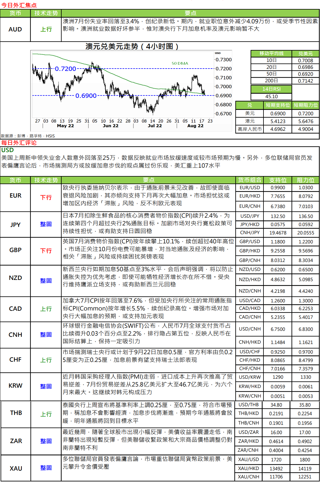 · 欧元区 7 月消费物价指数(CPI)终值按年上升 8.9%,较 6 月上升 0.3 个百分点,续创纪录新高。期内,食品、酒精和烟草成本的核心 CPI 终值亦由前月的 3.7%上升至 4%.面对区内通胀高企情况,欧央行执委施纳贝尔周四 (18 日) 表示,自 7 月加息以来,区内通胀前景未见改善。这表明即使面对经济衰退风险加剧,其亦倾向支持于 9 月 8 日的欧央行议息会上再次大幅加息。而由于俄乌事件持续,市场忧虑大幅加息将加剧经济出现「滞胀」风险,反不利欧元表现。