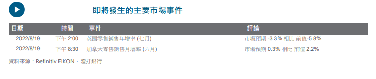 美联储政策风向难测;全球央行年会或提供更多线索昨日美联储委员们给出的政策风向不一,但总体而言基调仍偏向鹰派。政策取态偏鹰的圣路易斯地区联储主席布拉德呼吁 9 月再加息 75 个基点,堪萨斯城地区联储主席乔治则在继续加息上较为谨慎。继强劲的零售销售和就业数据後,昨天公布的费城制造业活动指数意外扩张,可能支持美联储在下个月继续加息75个基点(货币市场对加息50或75 个基点的看法分歧)。美联储下周五将举行全球央行年会,可望透露更多线索。