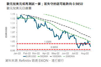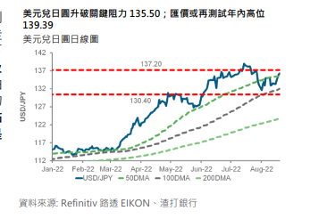 美国初领失业救济人数和费城联邦制造业数据优於预期,支持美元兑外币普遍向好。美元指数突破关键阻力 107.4,可能代表近期下跌趋势已经消退。美元指数有可能再度测试 7 月的 20 年高位 109.3 附近水平。欧元兑美元收市走低;市场再度关注汇价位於一算附近支持。同样,英镑下跌并可能测试 7 月低位 1.1757.由於英镑和加元分别触及预期和中性水平,我们结束了看淡英镑和加元的观点。由於美元走强可能打压金价,因此我们亦结束了等待开启的黄金观点。美元兑日圆突破关键阻力 135.50,我们的观点亦因而转至看好,汇价初步阻力料於 137.20,139.40 料是下一阻力。