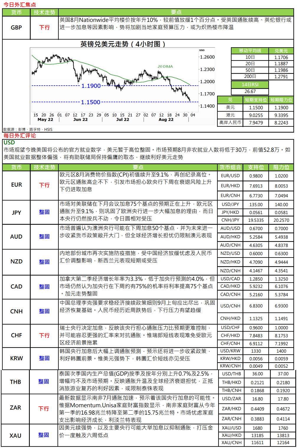 恒生银行:今日外汇黄金市场评论及操作建议(2022年9月2日)
